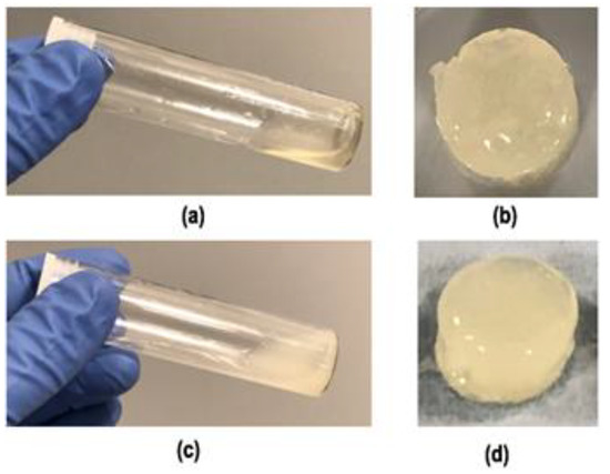 Images of the final homogeneous solutions (a) transparent CI (CS, 5% (w/v) initial concentration) and (c) composite sol, SI: CS-0.1HA-0.005Hep (solutions were obtained after neutralising with NaHCO3 and 2 mL of the solution was taken into a glass-tube (75 mm × 18 mm) with three level push polythene plug cap) and hydrogels of (b) CI and (d) SI acquired after heat treatment in one level open plug cap of the tube at 37 °C-oven for 48 h.