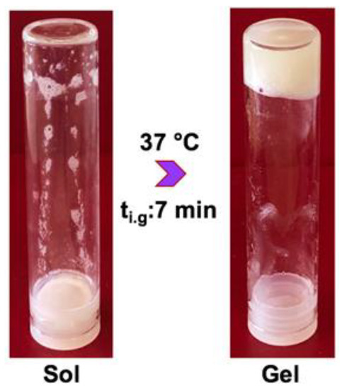 A representative sol–gel transition image of a composite SI hydrogel solution (2 mL) in a closed glass test tube (75 mm × 18 mm) placed into a silicone oil bath at 37 °C. ti.g.: incipient gelation point was determined with the test tube invert method as 7 min.