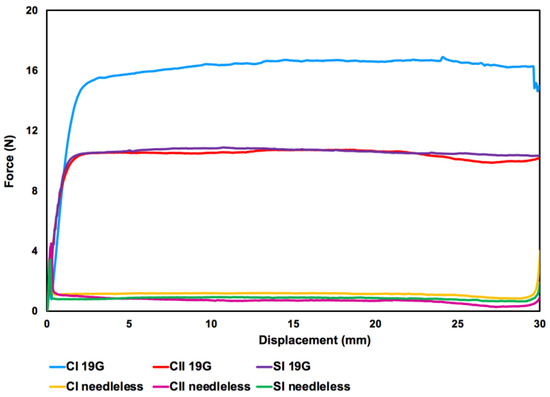 A representative graph of the injectability tests of hydrogel solutions via force versus displacement measurements. CI/II—define; 19G—define; SI—define.