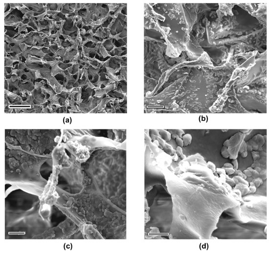 The SEM images of SIII:CS-0.1HA-0.25Hep at different magnifications; (a) 500 (Scale bar is 100 µm); (b) 5000 (Scale bar is 10 µm); (c) 10,000 (Scale bar is 5 µm); (d) 20,000 (Scale bar is 3 µm).