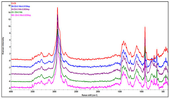 A comparison of FT-Raman spectra of all hydrogel samples obtained by mean of nine spectra from a square area mapping and baseline corrected and offset data in OMNICTM software.