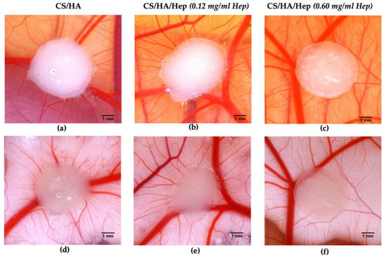 Comparative chorioallantoic membrane (CAM) images taken at day-14 of embryo incubation to evaluate angiogenic response of hydrogel samples: (a) CII: CS.0.1HA; (b) SI: CS.0.1HA.0.005Hep (0.12 mg/mL Hep); (c) SIII: CS.0.1HA.0.025Hep (0.60 mg/mL Hep), and images after white cream injection underneath CAM to make blood for contrast: (d) CII; (e) SI; (f) SIII.