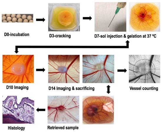 - Mangir, N.; Dikici, S.; Claeyssens, F.; Macneil, S. Using Ex Ovo Chick Chorioallantoic Membrane (CAM) Assay to Evaluate the Biocompatibility and Angiogenic Response to Biomaterials. ACS Biomater. Sci. Eng. 2019, 5, 3190–3200. [Google Scholar] [CrossRef]