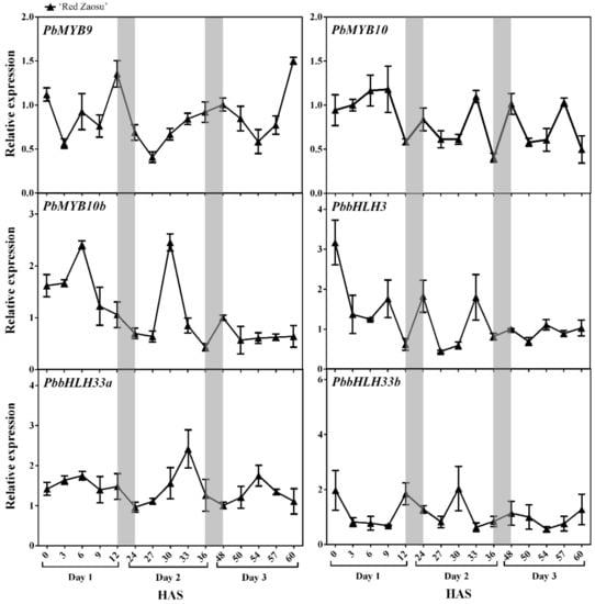 The expression patterns of typical anthocyanin-related transcription factors in ‘Red Zaosu’ pear fruit skin. The expression patterns of PbMYB9, PbMYB10, PbMYB10b, PbbHLH3, PbbHLH33a and PbbHLH33b in ‘Red Zaosu’ fruit skin over three continuous days. The gray boxes indicate nighttime. HAS: hours after sunrise of day 1. The NCBI accession numbers of the typical transcription factors are listed in Supplementary Table S1. Error bars represent SEs of the means (n = 3).