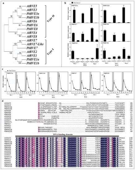 Seven selected pear RVEs were isolated from the Chinese pear genome [] (http://peargenome.njau.edu.cn/, March 1, 2018). To analyze the relationship between PbRVE and AtRVE proteins, a phylogenetic tree was constructed using the Neighbor-Joining method (Figure 3a). These PbRVE proteins were classified into two subgroups. The PbRVE1s and PbRVE7 clustered into type I, while the PbRVE3s, PbRVE6 and PbRVE8 clustered into type II (Figure 3a).