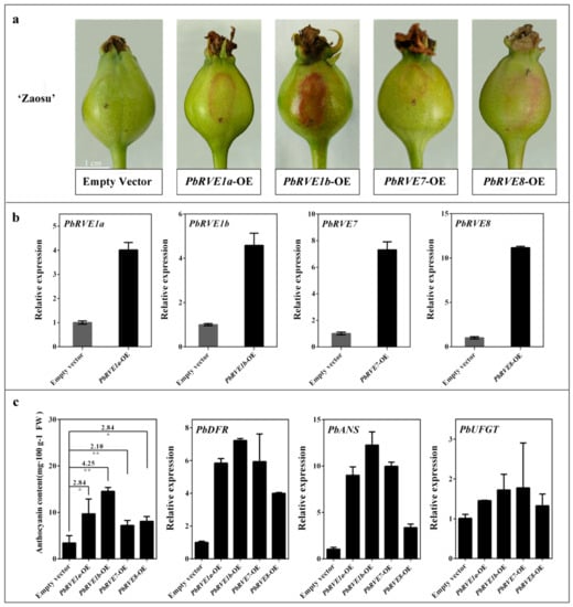 To investigate the bio-functions of PbRVEs in anthocyanin regulation, these candidates were transiently overexpressed using agrobacterium-infiltration of the skin of ‘Zaosu’ fruitlets. The validity of the ‘Zaosu’ fruitlets’ infection was validated by monitoring the β-glucuronidase gene (GUS) signal (Supplementary Figure S2). The transient overexpression of PbRVE1a, 1b, 7 and 8 independently in ‘Zaosu’ fruitlet skins increased the anthocyanin accumulation (Figure 4). However, the promotive efficiency among these PbRVEs varied (Figure 4a,b). Consequently, the overexpression of PbRVE1b resulted in an intense pigmentation of the pear fruitlet skins (4.25 times darker than controls), whereas lighter pigmentation was observed when PbRVE1a, 7, and 8 were independently overexpressed in pear fruitlet skins (from 2.10 to 2.84 times darker than controls) (Figure 4c). Additionally, the virus-induced gene silencing (VIGS) of PbRVE1a, 1b, 7 and 8 independently in ‘Palacer’ (P. communis L.) fruitlet skins decreased the anthocyanin accumulation (Supplementary Figure S3). The expression levels of PbDFR and PbANS significantly increased in PbRVEs-overexpression (OE) ‘Zaosu’ fruitlet skins, especially PbRVE1b-OE ‘Zaosu’ fruitlet skins, but the expression level of PbUFGT was not affected (Figure 4c). Thus, PbRVEs promote the expression levels of PbDFR and PbANS to increase the anthocyanin accumulation in ‘Zaosu’ pear fruit.