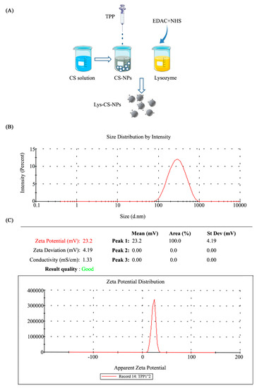 Characterization of nanoparticles: (A) schematic illustrations of the preparation process of Lys-CS-NPs; (B) particle size distribution of Lys-CS-NPs; and (C) zeta potential distribution of Lys-CS-NPs.
