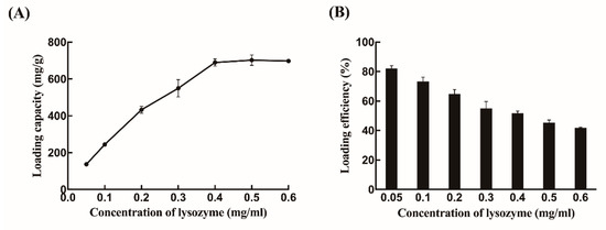 Analysis of lysozyme immobilized chitosan nanoparticles (Lys-CS-NPs): (A) lysozyme loading capacity of Lys-CS-NPs; and (B) lysozyme loading efficiency of Lys-CS-NPs.
