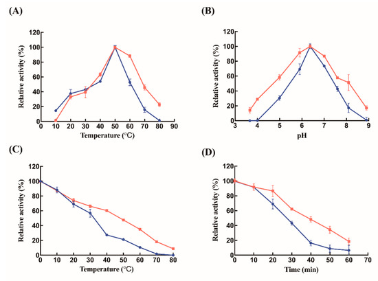 Biochemical characterization of free (blue circles) and immobilized (red squares) lysozyme. (A) Optimal temperature of the free lysozyme and immobilized lysozyme. The activities were determined in 20 mM sodium phosphate buffer (pH 6.5) for different temperatures from 10 to 80 °C. (B) The effect of pH on the activities of free lysozyme and immobilized lysozyme. Enzymatic activity assay was processed at 50 °C in various buffers as follows: 20 mM sodium acetate buffer (pH 3.7–5.0), 20 mM phosphate buffer (pH 6.0–7.0), and 20 mM glycine-NaOH buffer (pH 7.6–8.9). (C) Thermal stability of free lysozyme and immobilized lysozyme. Enzyme was incubated at various temperatures without substrate for 30 min and then its residual activities assayed at 50 °C and pH 6.5. (D) Thermo-stability of free and immobilized lysozyme at 37 °C for incubation at different times. The enzymatic activity of a fresh sample of free or immobilized lysozyme measured in 20 mM sodium phosphate buffer and at 50 °C was defined as 100%.