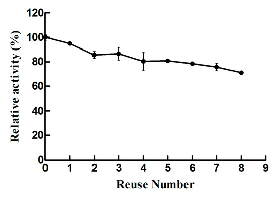 The immobilized Lys-CS-NPs were washed with phosphate buffer (20 mM, pH 7.0) and resuspended into fresh substrate solution to start a new cycle following by testing its residual activities. As shown in Figure 4, immobilized lysozyme exhibited better reusability, whereas its activity decreased steadily with increasing number of using cycles and retained 71.1% of initial activity following the final eighth cycle. Free lysozyme was only use once and taken as a control. Evidently, immobilized Lys-CS-NPs exhibited superb reusability and excellent activity, due to the immobilized chitosan materials preventing the deactivation and leakage of enzyme.