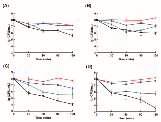 The bactericidal activities of CS-NPs, free lysozyme, a mixture of free lysozyme and CS-NPs, and Lys-CS-NPs against four strains (P. aeruginosa, K. pneumoniae, E. coli, and S. aureus) were determined (Figure 5). Lys-CS-NPs showed more pronounced effects toward S. aureus and E. coli at different times comparing with CS-NPs, free lysozyme, a mixture of free lysozyme and CS-NPs. For P. aeruginosa and K. pneumoniae, even if the changes of the four agents were not significantly different at the initial treatment, Lys-CS-NPs showed better bactericidal activities at 120 min. In the treatment of four strains, Lys-CS-NPs showed better effects than the mixture of free lysozyme and CS-NPs, indicating that it was the combination of both elements in the same system and not just the addition of the two effects that improve the efficacy.