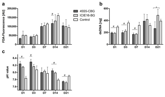 Quantification of cell viability (a), proliferation (b), and pH (c). Values are shown as means with standard deviation. # indicates significant difference to control group and * indicates significance between the bioactive glass (BG) groups being encompassed by brackets.