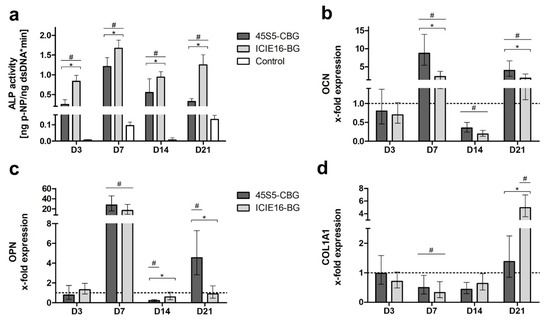 Alkaline phosphatase (ALP) activity was significantly higher in the ICIE16-BG group compared to 45S5-CBG on all days. In contrast to the control group, ALP activity was significantly induced in both BG groups from D3 to D14 (Figure 3a). Gene expression levels for osteocalcin (OCN) and osteopontin (OPN) reached a maximum on D7 and a second peak on D21 for both BG and CBG, showing higher values compared to the control, and 45S5-CBG surpassing ICIE16-BG (Figure 3b,c). Type I collagen alpha 1 (COL1A1) expression in the BG and CBG groups remained below the control until D14. On D21, the COL1A1 expression in the ICIE16-BG group significantly exceeded expression levels of both 45S5-CBG and control group (Figure 3d).
