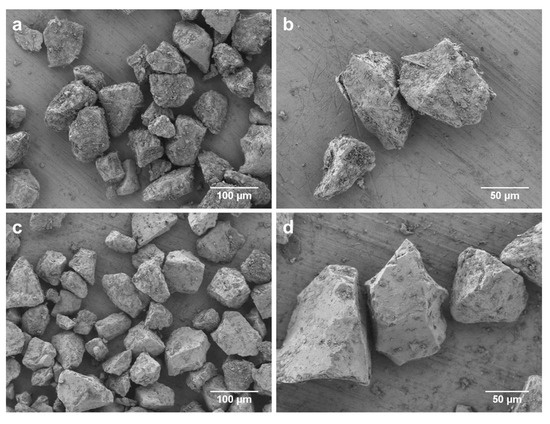 Bioactive glasses were prepared according to the melt-quench route using analytical grade reagents, namely, NaCO3 (Honeywell Fluka, Steinheim, Germany), K2CO3 (Alfa Aesar, Erlenbachweg, Germany), CaCO3 (Honeywell Fluka, Steinheim, Germany), CaHPO4·2H2O (Acros Organics, Geel, Belgium), and commercial grade Belgian quartz sand (SiO2). ICIE16-BG was melted in Pt crucibles at 1420 °C for 1.5 h, then cast in graphite molds and annealed at 520 °C for 1 h, and a second melting process was performed to ensure homogeneity. 45S5-BG was melted in Pt crucibles at 1400 °C for 1 h and quench rapidly in water. The glasses were crushed using a Jaw Crusher (Retsch, Haan, Germany) and ground into fine powder with a planetary ball mill (Retsch, Haan, Germany). Absolute ethanol (VWR Chemicals, Radnor, PA, USA) was used as a milling medium. For the production of the final granules, suitable sintering profiles to produce porous scaffolds were applied for each glass. ICIE16-BG was sintered at 690 °C for 1.5 h at a heating rate of 2 °C/min, resulting in an amorphous material [14], whereas 45S5-BG was sintered at 1050 °C for 2 h, inducing crystalline phases characteristic of glass-ceramics [8]. Sintered scaffolds were subsequently crushed, ground, and sieved to achieve granules of less than 125 µm, as depicted in Figure 4 (SEM Auriga, Carl Zeiss, Jena, Germany).