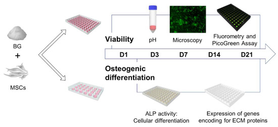 pH alterations and cell viability were measured and visualized on day 1 (D1), 3 (D3), 7 (D7), 14 (D14), and 21 (D21). ALP activity, which is known to increase with the differentiation of MSCs to osteoblasts [33,34], and expression of genes encoding for extracellular matrix (ECM) proteins were evaluated as correlates of osteogenic differentiation on D3, D7, D14, and D21, as schematically depicted in Figure 5.