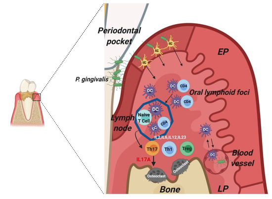 - Bittner-Eddy, P.D.; Fischer, L.A.; Kaplan, D.H. Mucosal Langerhans Cells Promote Differentiation of Th17 Cells in a Murine Model of Periodontitis but Are Not Required for Porphyromonas gingivalis-Driven Alveolar Bone Destruction. J. Immunol. 2016, 15, 1435–1446. [Google Scholar] [CrossRef]