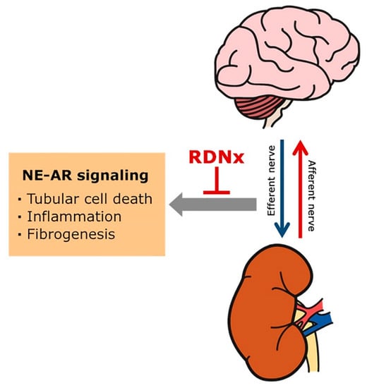 Increased renal sympathetic nerve activity leads to increased renin secretion, increased renal tubular sodium reabsorption, and decreased renal blood flow [,,]. Renal denervation (RDNx) is proposed as a therapeutic strategy used in treatment of resistant hypertension [,,]. RDNx performed surgically or chemically reduces sympathetic nerve activity and has been shown to reduce BP, improve renal function, and attenuate the progression of CKD in experimental models and humans of hypertension and CKD [,,,,,,,]. We reported that RDNx prevented the development of tubulointerstitial fibrogenesis and inflammation after unilateral ureteral obstruction (UUO) and kidney ischemia/reperfusion injury (IRI) independent of BP changes [,]. In addition, RDNx did not worsen kidney function of patients and renal injured mice—as assessed by glomerular filtration rate (GFR), plasma creatinine, cystatin C, or urea levels, and tubular morphological damages—indicating that it is safe even when CKD is present [,,,]. Here, we review the progress in our understanding of the molecular mechanisms of NE and ARs signaling in AKI, AKI to CKD transition and CKD.