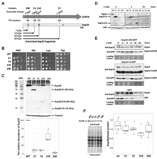 Nonsense mutations in the SUP35 gene lead to an omnipotent nonsense suppression and a decrease in the amount of full-length Sup35. (A) Localization of nonsense mutations in SUP35. PTC—premature termination codon. N, M, and C—Sup35 domains. (B) All sup35-n mutations lead to strong omnipotent suppression. Growth of haploid [psi−] cells with different sup35-n mutations on media for the detection of nonsense suppression after 5 days of incubation at 30 °C. Growth on media without tryptophan (-Trp) was used as a control. Ten-fold serial dilutions are shown. Numbers on the left correspond to sup35-n mutations. (C) Lysates of the strains shown on the Panel B were analyzed by Western blotting with anti-Sup35 and anti-Tubulin antibodies. The numbers above the lanes indicate the sup35 mutation. kDa—protein molecular weight marker. Fragments corresponding to the full-length and truncated Sup35 are marked by the arrows. Tubulin was used as a loading control. The plot below shows the amount of Sup35 in sup35-n mutants relative to the wild type strain. Dots correspond to the independent replicates. Amount of Sup35 in the wild-type (WT) is taken as 100%. (D) Steady-state level of Sup35 in yeast cells containing wild-type copy of SUP35 (WT) or nonsense mutations. Sup35 was estimated in 7A-D832 strain bearing pRSU1 plasmid with either WT SUP35 or one of the mutant sup35-n alleles after incubation in YPD medium containing 100 µg mL−1 cycloheximide (CHX) during 0, 4, or 20 h. The same strains as on the Panel B were used, in the case of sup35-74 truncated Sup35 fragment was not detected. Adh1 was used as a loading control. (E) Steady-state level of Sup35-240-GFP and Sup35-74-GFP in yeast cells containing wild-type copy of SUP35. For the CUP1 promoter induction cells were grown in selective medium containing 50 µM CuSO4 during 2 h. The amount of Sup35 or its fragments fused with GFP was estimated in 7A-D832 strain bearing pRSU1 plasmid with wild-type SUP35 in combination of pRS316-pCUP-SUP35-240-GFP (Sup35-240-GFP) or pRS316-pCUP-SUP35-74-GFP (Sup35-74-GFP) after incubation in SC-Leu-Ura medium containing 100 µg mL−1 cycloheximide (CHX) during 0 ‒ 20 h. pRS316-pCUP-GFP (GFP) was used as a control. Coomassie staining of the same gel was used as a loading control. (F) Strains with sup35-n mutations have the same Sup45 level. Sup45 quantity was normalized to the total protein in the same gels using gel documentation system (ChemiDoc XRS+ System, Bio-Rad, Hercules, CA, USA). The difference between amount of Sup45 for WT and sup35-n mutants in Wilcoxon rank-sum test was not found. Dots correspond to the independent replicates.
