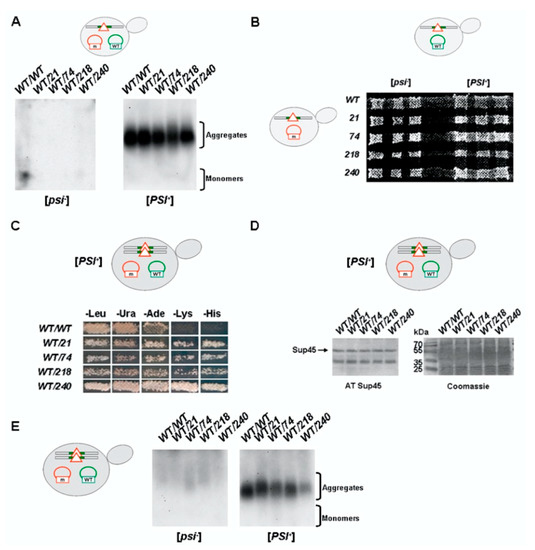 Thus, diploid cells obtained by the mating of [PSI+] strains with [psi−] strains and containing only plasmid with sup35-21, sup35-74, or sup35-218 mutations are able to maintain the [PSI+] prion. However, [PSI+] undergoes changes in its properties, and likely the prion variants, that are manifested by an increase in aggregate size and their loss after changing the mutant allele to the wild-type. Diploid cells containing sup35-240 mutation lost the [PSI+] prion.