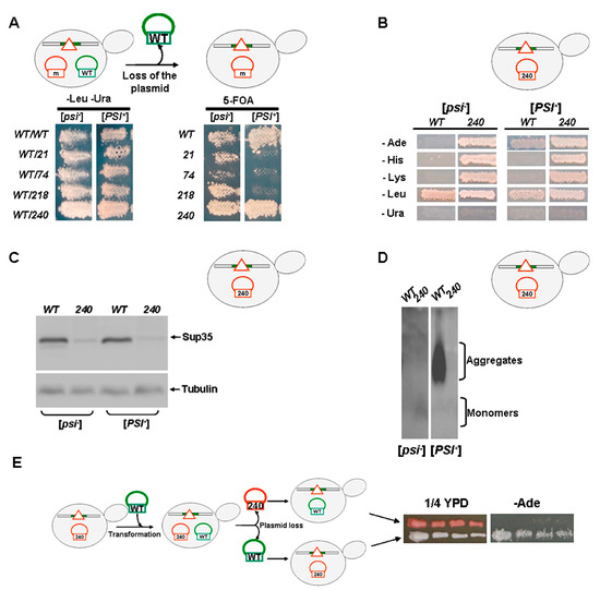 Haploid transformants containing two plasmids, one with the SUP35 allele and another with the sup35-n mutation, described in the previous section (Figure 3A), were replica plated on a medium containing 5-FOA (see Figure 2A). Only in the case of the sup35-240 mutation the substitution of the SUP35 allele in the [PSI+] strain was observed (Figure 4A). In the isogenic [psi−] strain, all transformants were able to grow on the 5-FOA containing medium, albeit with different efficiency (Figure 4A).
