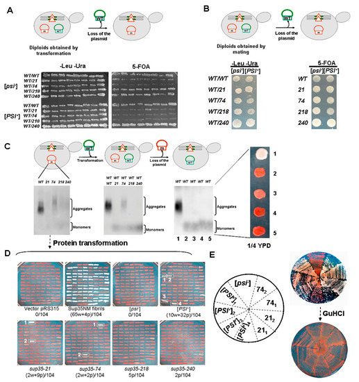 Thus, in [PSI+] haploid cells plasmids bearing sup35-21, sup35-74, and sup35-218 mutations are unable to substitute plasmid with the SUP35 gene, leading to lethality of yeast cells in the 5-FOA media. In [PSI+] cells with sup35-240 plasmid, only cells that had lost the prion were selected.