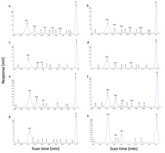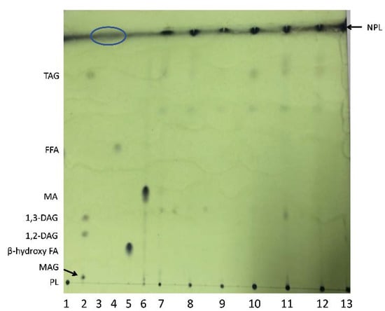 - Striby, L.; Lafont, R.; Goutx, M. Improvement in the Iatroscan thin-layer chromatographic–flame ionisation detection analysis of marine lipids. Separation and quantitation of monoacylglycerols and diacylglycerols in standards and natural samples. J. Chromatogr. 1999, 849, 371–380. [Google Scholar] [CrossRef]