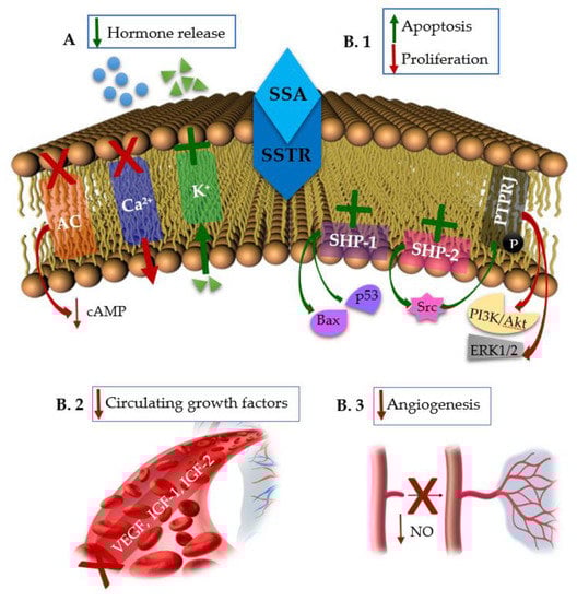 Mechanisms of action of Somatostatin synthetic Analogs (SSAs). (A). The antisecretory effects occur through the inhibition of the enzyme adenylyl cyclase (AC), the inhibition of voltage-dependent calcium channels and the stimulation of voltage-dependent potassium channels. (B). The antiproliferative effects. (B.1) Direct antiproliferative effects occur through the activation of the Src Homology 2 Domain Phosphatase-1 (SHP-1) and Src Homology 2 Domain Phosphatase-2 (SHP-2). SHP-1 triggers intracellular pro-apoptotic signals by the induction of p53 and Bax, while SHP-2 activates the tyrosine kinase Src that induces the phosphorylation of protein tyrosine phosphatase receptor type J (PTPRJ), which, in turn, dephosphorylates phosphatidylinositol 3-kinase (PI3K/Akt) and extracellular signal-regulated protein kinases 1 and 2 (ERK1/2), impairing cell proliferation. (B.2 and B.3). Indirect antiproliferative effects occur through the inhibition of circulating growth factors like vascular endothelial growth factor (VEGF), insulin-like growth factor 1 (IGF-1), insulin-like growth factor 2 (IGF-2) (B.2) and through the inhibition of tumor angiogenesis by altering the release of nitric oxide (NO) (B.3). (Red “X”: Inhibition; Green “✚”: Stimulation).