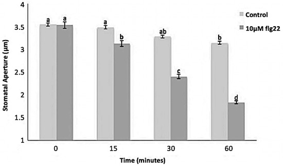 Stomatal movement in response to 10 μM flg22. Data were obtained from 180 stomata from three independent experiments and presented as means ± SE. Different letters indicate significantly different mean values at p < 0.05.