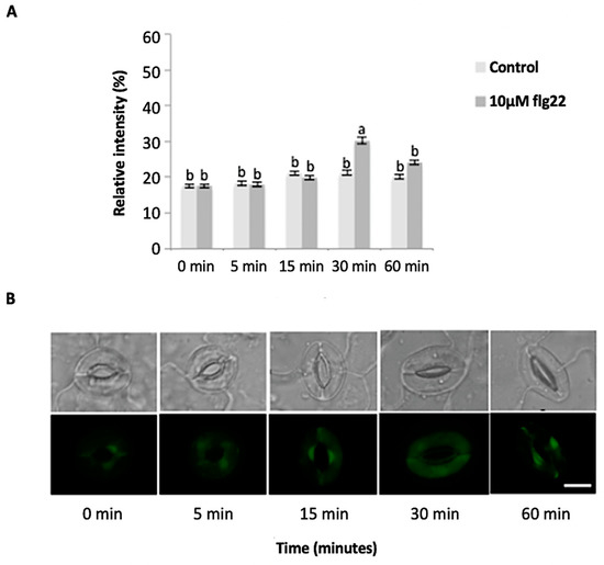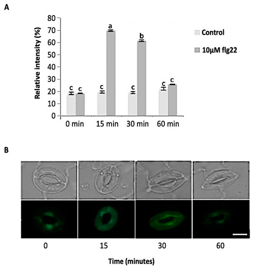 Reactive oxygen species (ROS) sproduction in guard cells in response to 10 μM flg22. (A) ROS levels measured from a total of 180 stomata from three independent experiments and presented as means ± SE. Different letters indicate significantly different mean values at p < 0.05. (B) Representative images of stomatal guard cells at each time point are shown. Scale bar: 10 µm.