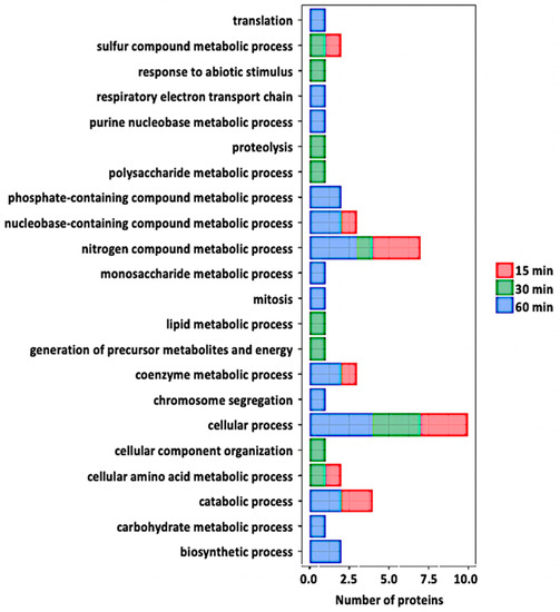 Gene ontology analysis of the redox proteins after flg22 treatment. Relevant biological processes are shown on the y-axis. Number of proteins significantly redox-regulated at each time point after treatment is shown on the x-axis.