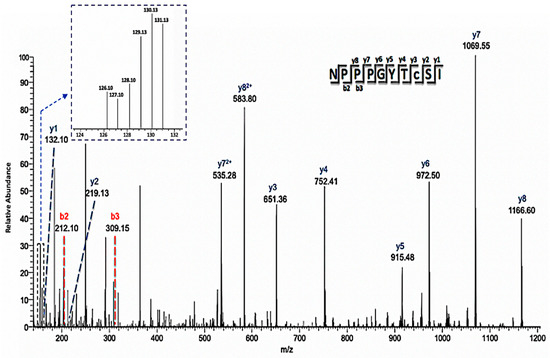 Annotated mass spectrum of a representative cysteine-containing peptide (C8-iodoTMT) showing differential redox status from control and treated samples. The MS/MS ions used to identify the peptide were labeled, and the intensity of the individual iodoTMT peaks for quantification was inserted in the upper left corner. This peptide is one of two that was used to identify lipid-transfer protein isoform II as a potential NO regulated protein.