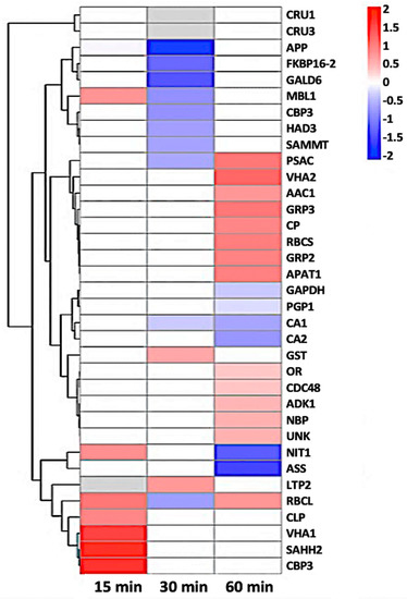 Heat-map of 35 nitrosylated proteins obtained by hierarchical clustering. The columns represent different time point ratios of treatment/control. The rows represent individual proteins. Protein AGI numbers are listed to the right. The increased and decreased proteins are represented in red or green, respectively. The color intensity increases with increasing differences, as shown in the scale bar. Please refer to Table 1 for detailed information.