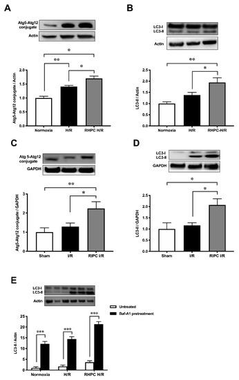 Effect of RIPC prior to I/R on autophagy protein expression in vitro and in vivo. Western blot analysis of Atg5-Atg12 conjugate in (A) H9c2 cells, (B) rat heart lysate and LC3 protein levels in (C) H9c2 cells, (D) rat heart lysate, and (E) bafilomycin-A1-treated H9c2 cell extracts, expressed as mean ± SEM, fold relative to control; * p < 0.05, ** p < 0.01.