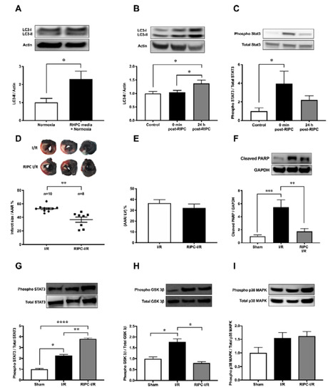 Effect of RIPC on autophagy and the cardioprotective signaling mechanism. Western blot analysis of (A) LC3 in H9c2 cells subjected to RHPC (preconditioned) media under normoxic conditions and (B) LC3 in the rat heart and (C) STAT3 phosphorylation in the rat heart assessed in the control group (without any intervention or sham surgery), at 0 min and 24 h post-RIPC. (D–I) Rats subjected to I/R with and without prior RIPC. (D) MI size expressed as the percentage of infarct size/AAR, (E) cumulative data of AAR/LV expressed as the percentage of the mean ± SEM. Western blot analysis of rat heart tissue assessing the (F) cleaved PARP (n = 8), (G) phosphorylated STAT3 (n = 8), (H) phosphorylated GSK-3β (n = 8), and (I) phosphorylated p38 MAPK (n = 8) levels at 24 h post-I/R with and without prior hindlimb RIPC. Results are expressed as mean ± SEM relative to control; * p < 0.05, ** p < 0.01, *** p < 0.001, **** p < 0.0001.