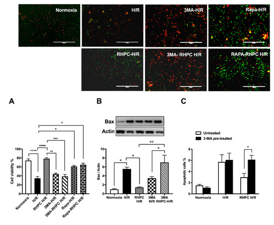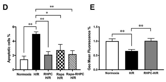 To assess the importance of autophagy in the RIPC protective effect, H9c2 cells were pre-treated with 3-Methyladenine (3-MA) (inhibits autophagy) or rapamycin (Rapa) (promotes autophagy) prior to stimulation in the H/R injury model (Figure 3A). Pre-treatment with 3-MA significantly reduced cell viability in 3-MA RHPC-H/R cells compared to RHPC-H/R alone (38.89 ± 4.44% vs. 78.43 ± 3.68%, p < 0.0001). In contrast, pre-treating the cells with rapamycin significantly reduced cell viability in the RAPA-RHPC-H/R group compared to RHPC-H/R alone (64.93 ± 3.47% vs. 78.43 ± 3.68%, p < 0.05) and in Rapa H/R compared to H/R (61.32 ± 2.22 vs. 34.83 ±3.63, p < 0.05). Consistent with these results, pro-apoptotic Bax protein expression was significantly increased with 3-MA RHPC-H/R treatment compared to RHPC-H/R alone (7.02 ± 1.60 vs. 1.44 ± 0.11-fold relative to the normoxic control, p < 0.01) (Figure 3B). Additionally, 3-MA pre-treatment resulted in a significant increase in H9c2 apoptosis in the RHPC-H/R group compared to the untreated RHPC-H/R group (6.13 ± 0.77% vs. 2.97 ± 0.69%, p < 0.05) (Figure 3C). However, treatment with rapamycin prior to H/R resulted in a significant decrease in apoptosis in the H/R group compared to the untreated H/R group (2.75 ± 0.79% vs. 5.01 ± 0.30%, p < 0.05) (Figure 3D). Changes in the mitochondrial membrane potential triggers the cycle of reactive oxygen species (ROS) formation [46], and is linked with cell death [47,48]. We analyzed the mitochondrial membrane potential level in H9c2 cells with and without RHPC prior to H/R. The mitochondrial membrane potential was lost in the H/R group (0.66 ± 0.05%-fold relative to control, p < 0.01); however, the mitochondrial membrane potential was maintained in the RHPC-H/R group (1.01 ± 0.08%-fold relative to control, p < 0.05 vs. H/R) (Figure 3E).