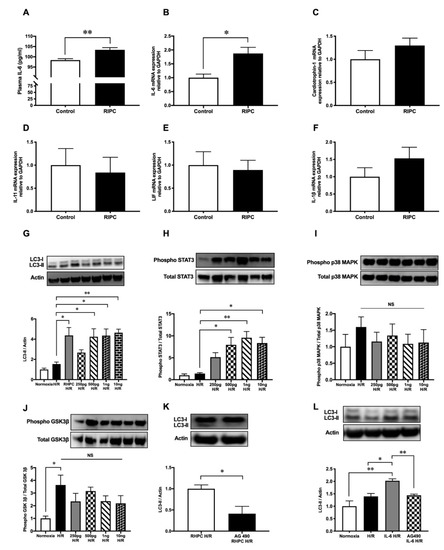 RIPC modulates cytokines’ expression and recombinant IL-6 treatment induces autophagy through the JAK-STAT pathway. (A) Plasma IL-6 protein levels at 0 min post-RIPC expressed as mean ± SEM, n = 5, p < 0.01. mRNA expression of (B) IL-6, (C) cardiotrophin-1, (D) IL-11, (E) LIF, and (F) IL-1β in rat hind limb muscle at 0 min post-RIPC assessed by qPCR and expressed as mean ± SEM; n = 9, * p < 0.05. Western blot analysis of (G) LC3, (H) phosphorylated STAT3, (I) phosphorylated GSK-3β, and (J) phosphorylated p38 MAPK in H9c2 cells pre-treated with different concentrations of IL-6 (250 pg/mL, 500 pg/mL, 1 ng/mL, 10 ng/mL) during hypoxia followed by reoxygenation. The expression levels of phosphorylated proteins were normalized to total STAT3, GSK-3β, and p38 MAPK, respectively. Results are expressed as mean ± SEM; * p < 0.05, ** p < 0.01. H9c2 cells exposed to RHPC-H/R with and without the JAK-STAT pathway inhibitor tyrphostin AG-490. Representative immunoblots and statistical data of (K) LC3 protein are expressed as mean ± SEM, fold relative to the RHPC-H/R group. (L) Representative immunoblot of the LC3 protein level in H9c2 cells with IL-6 treatment during hypoxia with and without tyrphostin AG-490 pre-treatment followed by reoxygenation are expressed as mean ± SEM, fold relative to the normoxic control; n = at least 3 independent experiments, * p < 0.05, ** p < 0.01.
