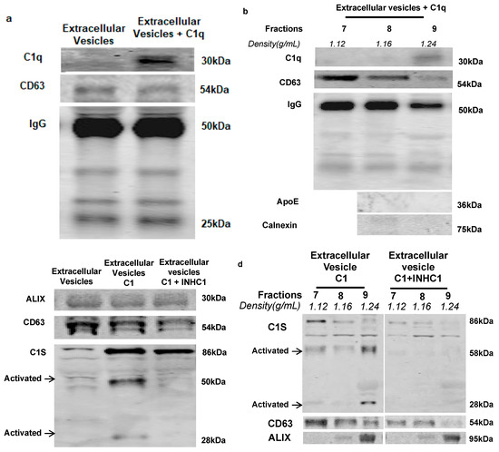 Western blot analysis of complement activation with rat plasma extracellular vesicle isolated via ultracentrifugation and purified by OptiPrep density gradient. (a) Binding of human complement protein, C1q, to ultracentrifugation isolated rat plasma extracellular vesicles. (b) C1q specifically bound to rat plasma extracellular vesicles with density at 1.24 g/mL (fraction 9). This fraction was negative for ApoE and Calnexin. (c) C1 activation assay showed that C1 was activated by ultracentrifugation-isolated rat plasma extracellular vesicles (middle-lane) and C1 activity was inhibited in the presence of C1 inhibitor (INHC1) (right-lane). (d) Incubating C1 complex with rat plasma extracellular vesicles followed by fractionation using OptiPrep density gradient showed that C1 complex bound to extracellular vesicle at 1.24 g/mL density (fraction 9) and activated serine protease subcomponent C1s (left), and the activity of the C1s was inhibited by C1 inhibitor (INHC1) (right). All of the experiments were repeated at least three times.