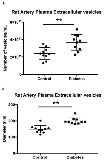 Comparison of rat artery plasma extracellular vesicles isolated via ExoQuick from control and STZ-induced diabetic (7 weeks) rats. (a) The number of vesicles was increased significantly in diabetic (7 weeks) rat plasma than in control. The number of vesicles isolated from plasma of control rats (circles) and STZ-induced diabetic rats (squares) was measured through the use of SLS (kilocounts per second). (b) Dynamic light scattering (DLS) measurement showed an increase of diameter in diabetic vesicles (squares) compared with control (circles). n = 10 for control and diabetes, ** p < 0.05. (c) Western blot of artery plasma vesicles isolated through the use of ExoQuick from control and STZ-induced diabetic (7 weeks) rats. Under condition of equal volume loading, extracellular vesicle markers (TSG 101 and CD63) show no difference between combined control and diabetic plasma vesicles; however, an increased amount of IgG was observed in diabetic rat plasma, but not with control rat plasma. Moreover, diabetic rat artery plasma vesicles had higher C1 activity than control vesicles.