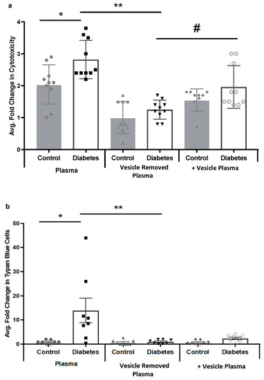 Cytotoxicity of the cells was quantified using an LDH assay kit, following the manufacturer’s protocol (Abcam, ab102526). First, 105 HRECs/100 µL were plated onto a 0.1% gelatin coated 96-well plate, incubated at 37 °C for 48 h, and then treated with 20% of control or diabetic rat plasma at 37 °C for 6 h. Additional conditions were created to determine the contribution of extracellular vesicles vs. other plasma components to cell cytotoxicity. Vesicle-removed control or diabetic plasma, and vesicle-removed control or diabetic plasma with control or diabetic extracellular vesicles added back in were used. After the treatment with plasma, the media was collected into a 1.5 mL Eppendorf tube and spun down at 10,000 g for 15 min at 4 °C. Supernatants (50 µL) were transferred into a 96 well plate and a mixed detection kit reagent (50 µL) was added to each well along with the NADH standard. The absorbance (450 nm) was taken on a micro-plate reader in a kinetic mode every 3 min for 30 min at 37 °C. LDH activity of the samples was calculated: LDH activity (milli-units/mL) = amount of NADH (nmol)/(Reaction Time × Sample Volume) × Dilution Factor. LDH concentration from no cell conditions (Figure S1) were subtracted from each condition before calculation of cytotoxicity.
