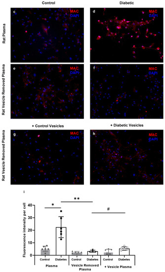 Diabetic rat plasma induced cytotoxicity and cell death in human retinal endothelial cells (HRECs). STZ-induced diabetic (seven weeks) rat plasma was collected from tail artery and extracellular were removed via ExoQuick combined with ultracentrifugation method. (a) With LDH Assay; after 6 h, (*) diabetic rat plasma (white bar) treated human retinal endothelial cells (HRECs) showed a significant increase of cytotoxicity compared to control plasma treated HRECs (grey bar). (**) When extracellular vesicles were removed from diabetic plasma (white bar), cytotoxicity was reduced compared with diabetic plasma treated HRECs (white bar). (#) After adding diabetic extracellular vesicles back into the vesicle-removed plasma condition, cytotoxicity showed a significant increase when compared with the diabetic vesicle-removed condition (white bars). LDH concentration from no cell conditions were subtracted from each condition before calculation of cytotoxicity. (b) Trypan Blue staining of detached HRECs showed similar results as LDH measurement. Experiments were performed in triplicates following the assay manufacturer’s recommendation, and results are presented as mean ± SD. Control plasma treated HRECs were used for normalization to other conditions in LDH and trypan blue assays. * p < 0.05, ** p < 0.01. (c–h) HRECs were treated with rat plasma in different conditions for 3 h, and rat MAC (red) deposition and cellular nuclei (DAPI) were measured by immunocytochemistry. Diabetic rat plasma-induced MAC deposition in HRECs. (d). MAC deposition was greatly reduced in HRECs treated with vesicle-removed diabetic rat plasma (f). Once diabetic extracellular vesicles were added back into the plasma, MAC deposition was observed again (h), while all the controls remain unchanged (c, e and g). (i) Fluorescence quantification of the MAC deposition in HRECs, fluorescence intensity and the number DAPI were measured by MetaMorph software. All images were taken and analyzed with 10× magnification.
