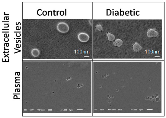 As cholesterol crystals were recently shown to have plasma cytotoxicity [16]. SEM under non-dehydrating conditions was performed on the samples used in HREC treatment experiments (Figure 5). SEM confirmed the presence of extracellular vesicles of ~100–200 nm diameter in both control and diabetic extracellular vesicle preparations. Blood plasma contained the particles ranging from ~5–700 nm diameter. There were no crystalline structures observed in blood plasma or extracellular vesicles isolated from control or diabetic animals. Non-hydrating SEM is not the ideal method to preserve the structures, thus these experiments were performed to rule out the role of cholesterol crystals, rather than to quantify and characterize the extracellular vesicles.