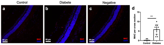 Membrane attack complex (MAC) deposition in the retina of rats with seven-weeks duration of STZ-induced diabetes. Retinal sections from a control rat (a) showed less MAC immunostaining (red fluorescence) than in a diabetic rat (b). (c) MAC negative staining of the diabetic rat retina section. Deposition and cellular nuclei (DAPI) staining in blue fluorescence. (d) Counts of the number of MAC deposits per retinal cross-section, *** p < 0.001, n = 7–11.