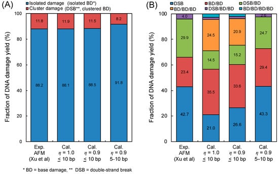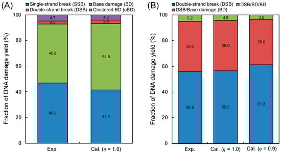 Figure 2 shows the comparison between the simulation results by our model and the experimental data [], where (A) is the fraction of isolated BD and the complex damage composed of DSB and cBD, and (B) is the fractions of DSB, BD/BD, DSB/BD, BD/BD/BD, DSB/BD/BD and BD/BD/BD/BD. It should be noted that the inter-lesion distance within 10 bp was used for estimating the yield of complex damage. Regarding both cases of η = 1.0 and 0.9, the calculated fractions of complex damage were in good agreement with the experimental results [], as shown in Figure 2A. Additionally, as shown in Figure 2B, highly complex forms (i.e., BD/BD/BD) and a high fraction of BD/BD can be seen in the simulation results, while the experiments did not show such tendencies.