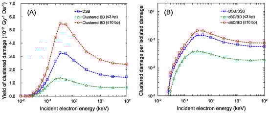 Yields of complex damage for mono-energetic electrons: (A) is the yields of complex base damage (BD) for various cluster sizes; (B) is the yield ratio of complex damage and isolated damage (complex BD (cBD) per BD and double-strand break (DSB) per single-strand break (SSB)). The blue square is YDSB/YSSB for a <10 bp cluster size, the red circle is the YcBD/YBD for a <10 bp cluster size, and the green triangle is the YcBD/YBD for a <3 bp cluster size.