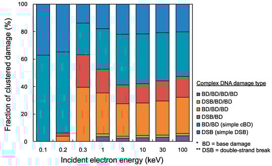 Using the present cluster analysis for predicting damage complexity, we finally estimated yield fractions of all complex DNA damage types (e.g., DSB, BD/BD, DSB/BD, BD/BD/BD, DSB/BD/BD, BD/BD/BD/BD). Figure 4 shows the fractions of complex DNA damage yields, i.e., simple DSB, BD/BD, DSB/BD, BD/BD/BD, DSB/BD/BD, BD/BD/BD/BD. Simple DSB and simple cBD (BD/BD) can be caused in a wide electron energy range of 100 eV–100 keV (shown as the blue and the light blue bar graph), while complex damage including more than two lesions cannot be induced in low energy electrons with 0.1 keV (shown as red, orange, green and purple in the bar graph). The integrated fractions of complex DNA damage including at least three lesions (e.g., DSB/BD, BD/BD/BD, DSB/BD/BD, BD/BD/BD/BD) for 0.3 keV electrons were the highest among the mono-energetic electrons below 100 keV, which was 63.1%. However, complex damage including four lesions (DSB/BD/BD, BD/BD/BD/BD) was induced by higher energy electrons than 0.3 keV, and the yield fraction for 1–100 keV electrons was 5.1% on average.