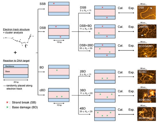 Identification of DNA damage type in the present simulation. The illustration on the left represents an electron track structure and a DNA cylinder. Considering the distance between two ionization and electronic excitation events, we identified single-strand break (SSB), double-strand break (DSB), base damage (BD), complex BD (cBD). The complexities of DSB and cBD then were determined from the number of events per cluster, Ncl, at the complex damage site (DSB and cBD). After estimating the yield of each DNA damage type, we compared the estimated results with experimental data [,,] (right images are example pictures obtained with AFM []).