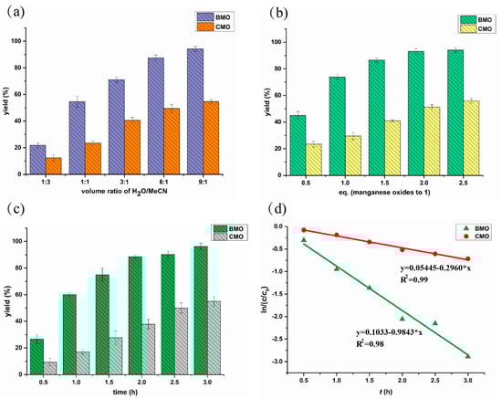Comparing the synthesis of α-hydroxy-β-keto ester by the BMO (biogenic manganese oxides) from dry m-MnB1 and CMO (chemical manganese oxides): (a) Effects of reaction media consisting of H2O/MeCN with different ratios; (b) Effects of dosage of BMO and CMO in H2O/MeCN (9:1); (c) Correlation of yield of 2 with time; (d) Pseudo-first-order plots of α-hydroxylation of β-keto Ester by BMO and CMO in the first 3 h.