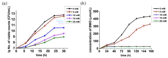 The effects of various concentrations of 1 on the manganese mineralization by the model strain were also probed. However, the manganese mineralization of MnB1 was found to be much more sensitive to substrate 1. A concentration of 5.0 mM has already shown a significant inhibition on mineralization process, which was found to be completely repressed at 10.0 mM or higher (Figure 3b). Since the generation of BMO by P. putida MnB1 was fundamentally accomplished via multicopper oxidase-catalyzed oxidation of Mn(II) into Mn(VI) in cell extracts within its active center with three Cu(II) sites [34,35,36], and the β-keto ester is known to chelate divalent metal ions, we speculate that compound 1 might potentially act as a multicopper oxidase inhibitor [37] to prohibit manganese oxide mineralization. Therefore, a maximum substrate concentration of 5.0 mM was selected for the following whole-cell biocatalytic oxidation of substrate 1.