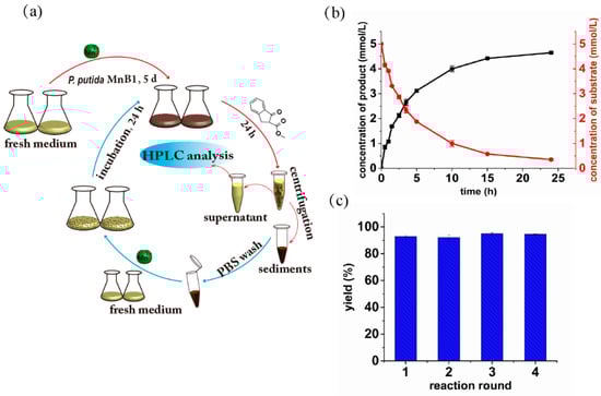 Synthesis of α-hydroxy-β-keto ester by the whole cells based on the biogenic manganese oxides: (a) Schematic diagram of the recycling experiments; (b) Profile of substrate consumption and product formation; (c) Yield of product 2 in recycling reaction.
