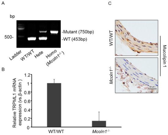 Characterization of Mcoln1−/− mice. (A) Mucolipin 1 KO (Homozygous, Mcoln1−/−) had one positive PCR product for mutant 750 bp. Heterozygous mice had two positive PCR products including 750 bp for mutant and 453 bp for WT/WT. WT/WT mice only had wild-type Mcoln1 gene (453 bp). (B) Mcoln1 gene deletion was validated by RT-PCR as depicted by mRNA expression of TRPML1 gene, also known as Mcoln1. Data are shown as mean ± SEM of values. n = 3. (C) Representative immunohistochemical images of aortic sections reveal abolished immunostaining of mucolipin 1 (brown stain) in Mcoln1−/− mice as compared to wild-type. n = 3. bp: Base Pair; Homo: homozygous; Hete: heterozygous.